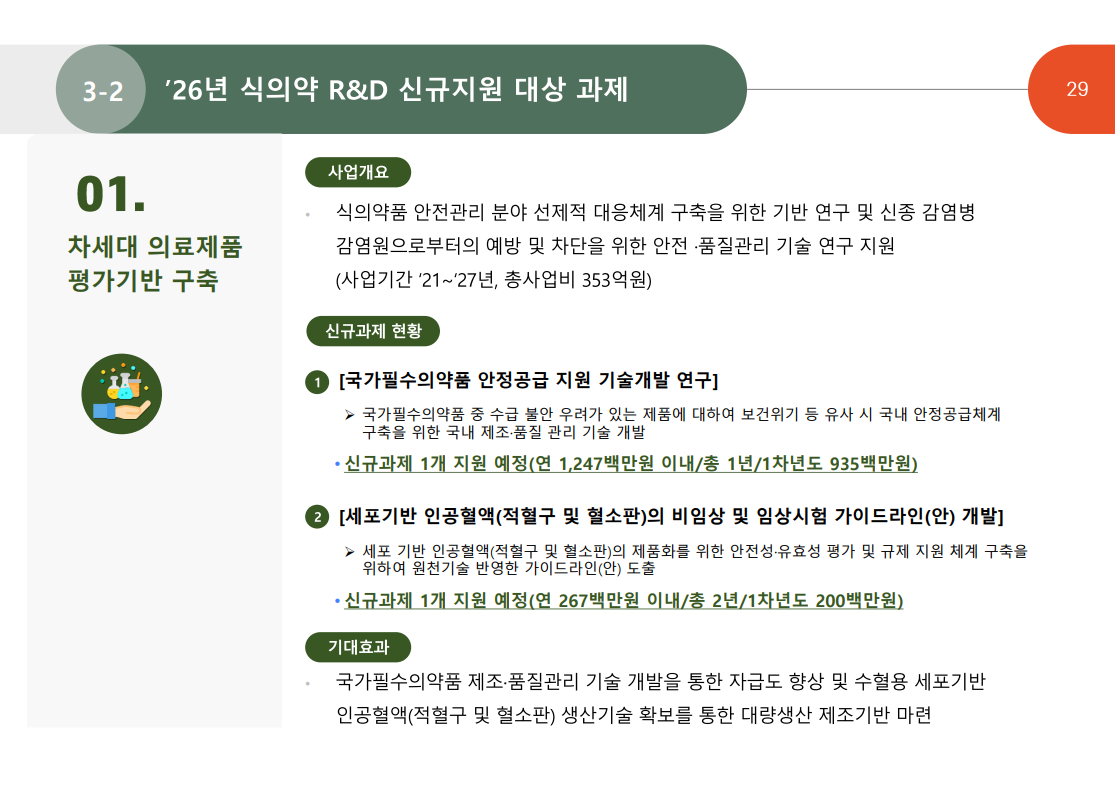 2026년 신규 사업 가운데 첫 번째로 소개된 사업은 ‘차세대 의료제품 평가 기반 구축 사업’이다. 이 사업은 식약처 안전관리 정책을 뒷받침하기 위한 기반 연구와 품질·안전 관리 기술 개발을 목표로 한다.