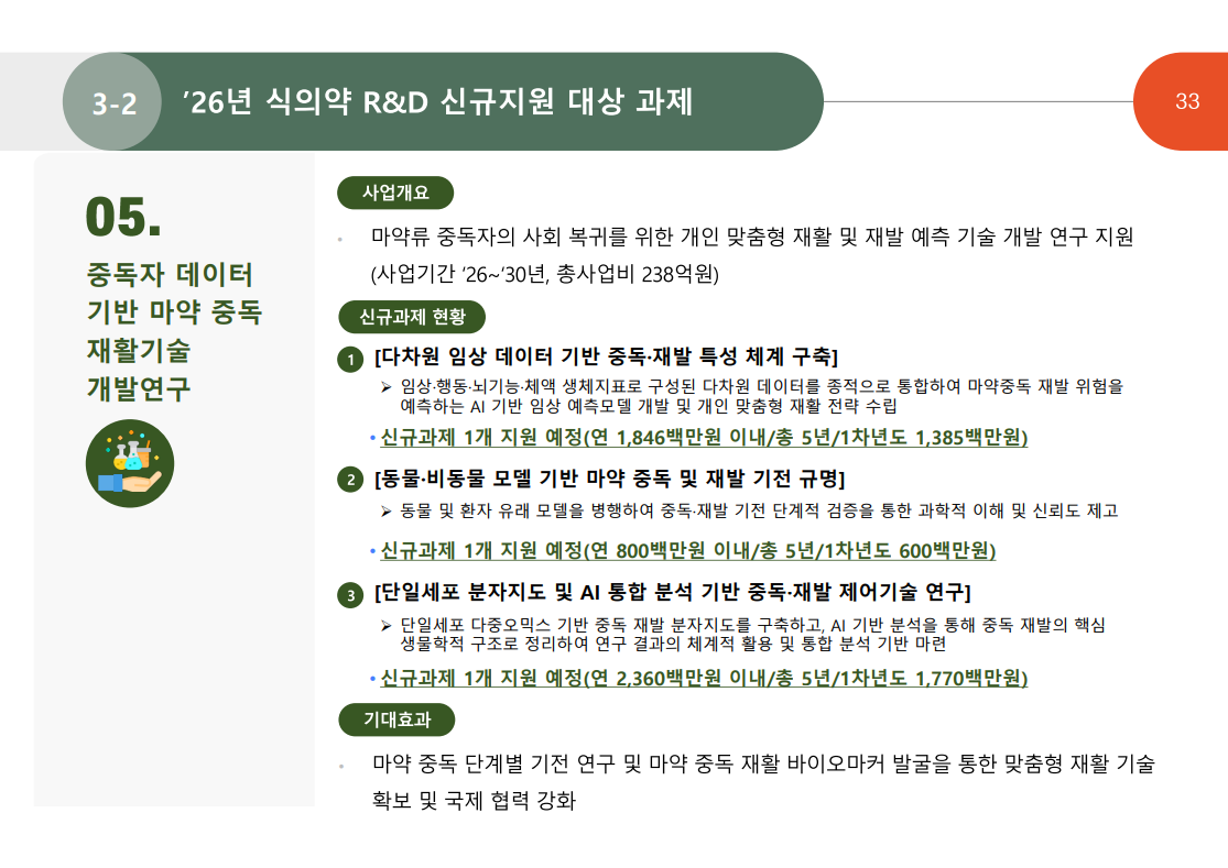 다섯 번째 신규 사업은 ‘중독자 데이터 기반 마약 중독 재활 기술 개발 연구’다. 이 사업은 마약류 중독자의 사회 복귀를 지원하기 위한 개인 맞춤형 재발 예측 및 제어 기술 개발을 목표로 한다.