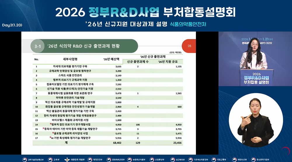 보건산업진흥원 첨단바이오기술R&D단 식의약 R&D팀 권보배 팀장은 20일 대전 한국과학기술원(KAIST) 대강당에서 열린 ‘2026 정부 R&D 사업 부처합동 설명회’에서 “2026년 신규로 지원되는 과제 수는 129개, 총 연구비 규모는 234억 원”이라며, “규제과학 관점에서 안전관리 기반을 강화하면서도, 혁신 기술과 제품화 가능성을 동시에 고려한 과제 구성이 특징”이라고 설명했다.