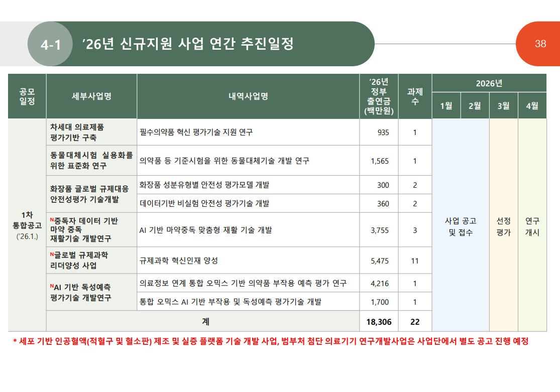 1차 신규 과제 통합 공고는 1월 6일부터 2월 6일까지 진행되며, 과제 신청 마감은 2월 6일 14시다. 선정 평가는 3월 중 진행되며, 이후 연구 과제가 개시될 예정이다.