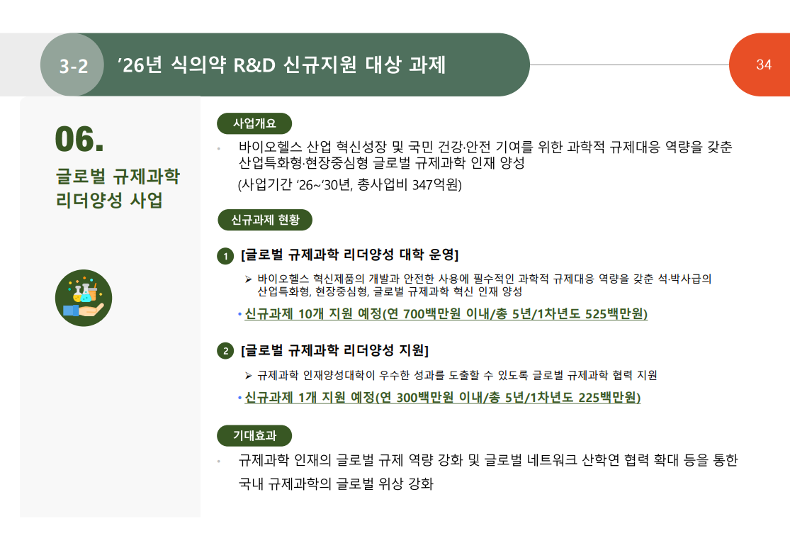 여섯 번째 신규 사업은 ‘글로벌 규제과학 리더 양성 사업’이다. 이 사업은 과학적 규제 대응 역량을 갖춘 산업 특화형·현장 중심형 규제과학 인재를 체계적으로 양성하는 것을 목표로 한다.