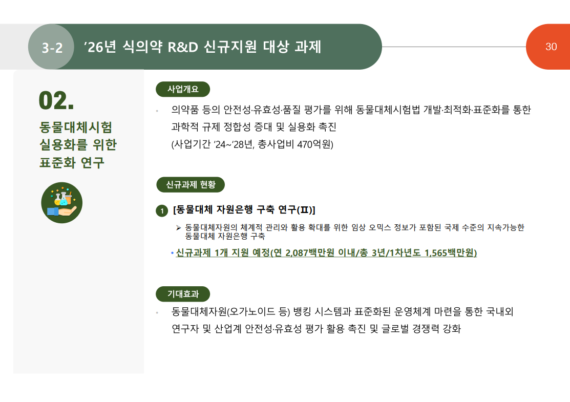 두 번째 신규 사업은 ‘동물 대체 시험 실용화를 위한 표준화 연구 사업’이다. 이 사업은 동물실험을 대체할 수 있는 시험법의 개발·최적화·표준화를 통해 과학적 규제 정합성을 높이고, 실제 규제 현장에서 활용 가능한 수준으로 끌어올리는 것을 목표로 한다.