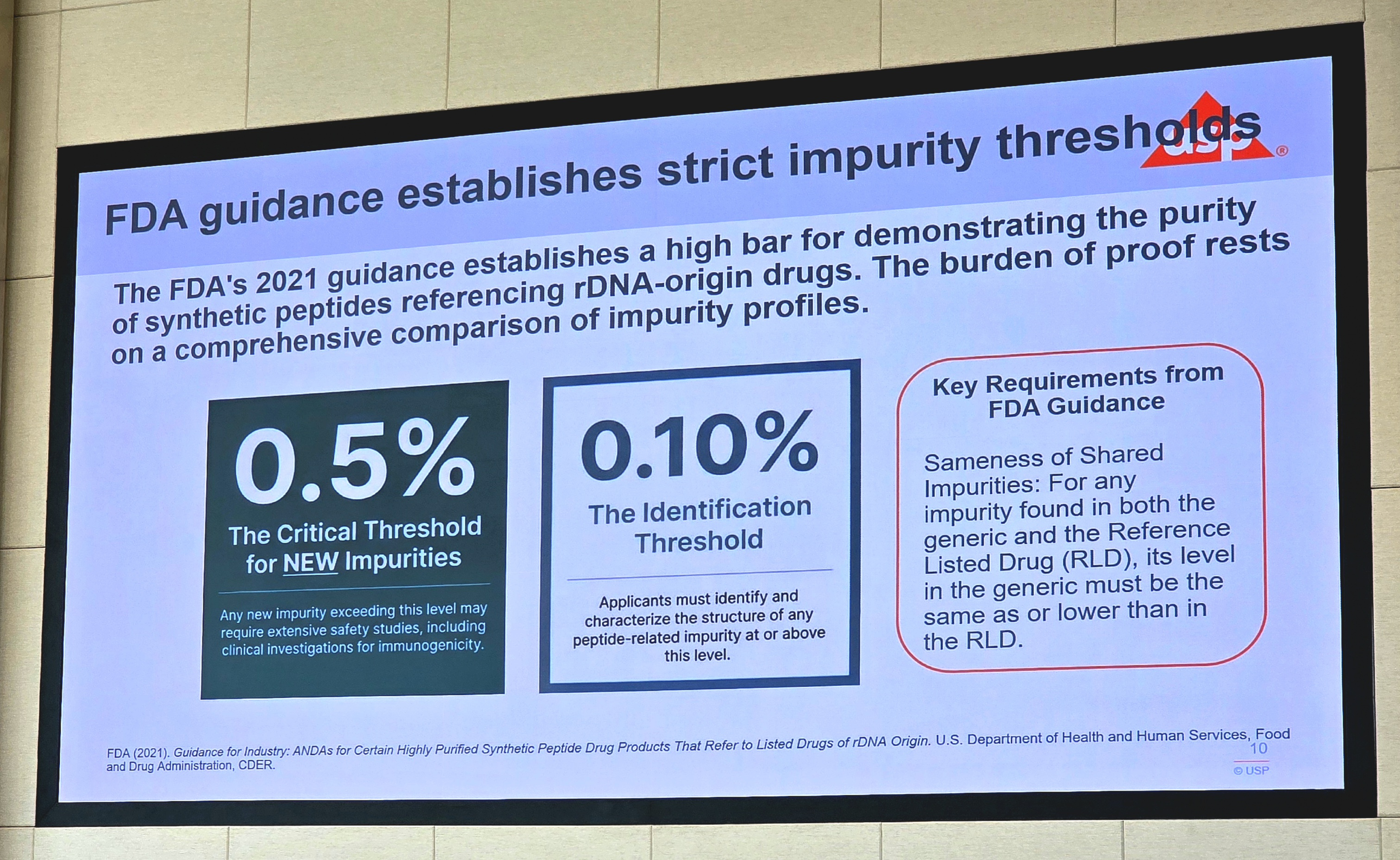 이 과정에서 USP의 역할이 부각된다. USP는 합성 펩타이드 의약품에서 고려해야 할 주요 품질 속성(Critical Quality Attribute)과 이를 원료 단계부터 어떻게 통제해야 하는지를 약전 및 가이드라인으로 제시한다.