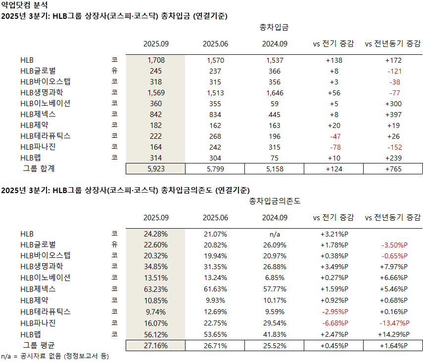 HLB의 총차입금은 1708억원으로 전 분기 대비 138억원 증가했고, 전년 동기 대비로도 172억원 늘었다. HLB생명과학은 1569억원으로 분기 기준 56억원 증가했으나, 전년 동기와 비교하면 77억원 감소했다.