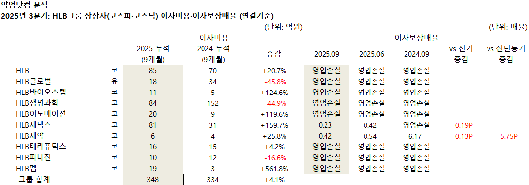약업신문은 HLB그룹 상장사 10곳(코스피·코스닥)이 금융감독원 전자공시시스템에 공시한 2025년 3분기 실적(연결기준)을 바탕으로 이자비용과 이자보상배율 등을 분석했다.