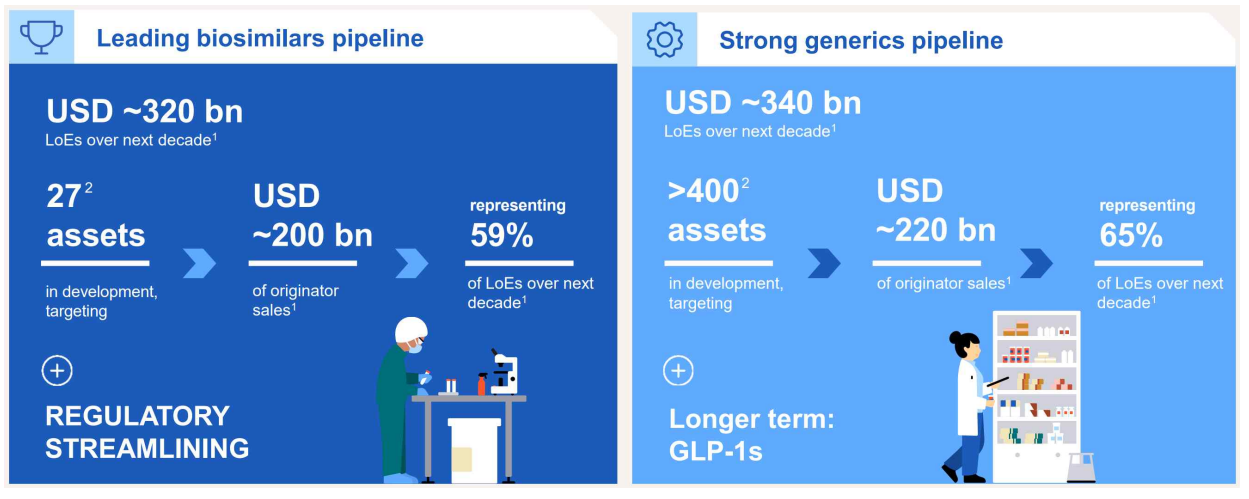 산도즈에 따르면 향후 10년간 글로벌 의약품 시장에서 6,000억 달러를 훨씬 웃도는 규모의 의약품이 특허 만료를 맞이할 것으로 전망된다. 이 가운데 제네릭 시장 기회는 약 3,400억 달러, 바이오시밀러 시장 기회는 약 3,220억 달러로 추산된다. 산도즈는 이러한 시장 환경을 저렴한 의약품(accessible medicines) 확대의 결정적 전환점으로 규정했다.