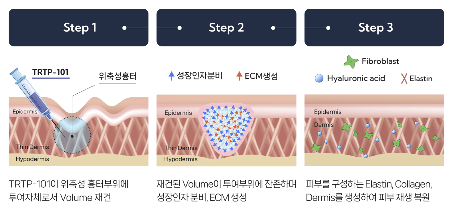 위축성 흉터는 진피층 콜라겐 소실로 인해 발생하며, 환자의 삶의 질과 심리적 만족도에 큰 영향을 미치지만 현재까지 근본적인 재생 치료제가 부재한 영역으로 평가받고 있다. TRTP-101은 피부 조직의 구조적 회복을 유도하는 차세대 오가노이드 기반 재생 치료제로, 기존 치료법의 한계를 극복할 혁신적 대안으로 기대를 모으고 있다.
