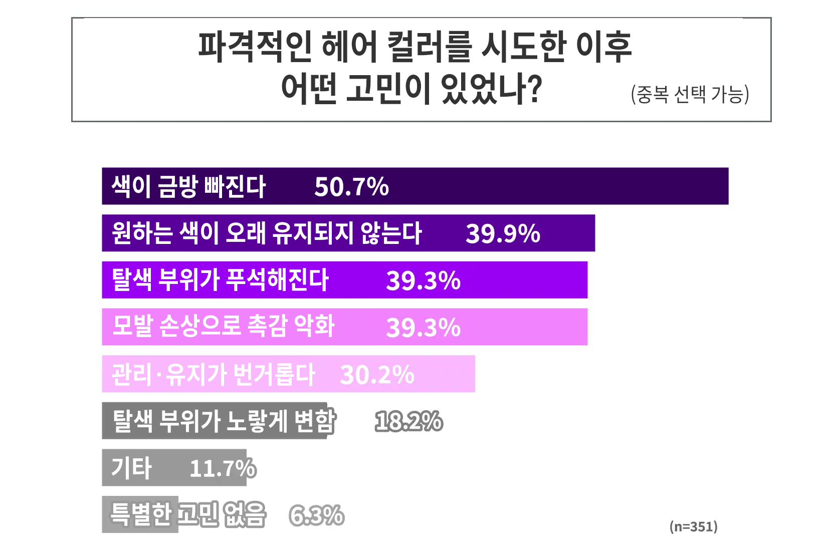 파격적인 헤어 컬러를 시도한 이후의 고민(중복 응답 가능)으론 색 유지와 관련된 응답이 많았다. ‘색이 금방 빠진다’는 응답이 50.7%로 가장 높았고, ‘원하는 색이 오래 유지되지 않는다’는 응답도 39.9%로 나타났다. 색 지속력과 관련된 두 항목을 함께 선택한 응답자 비율을 감안하면, 컬러 유지에 대한 불만이 핵심 문제로 인식되고 있다.