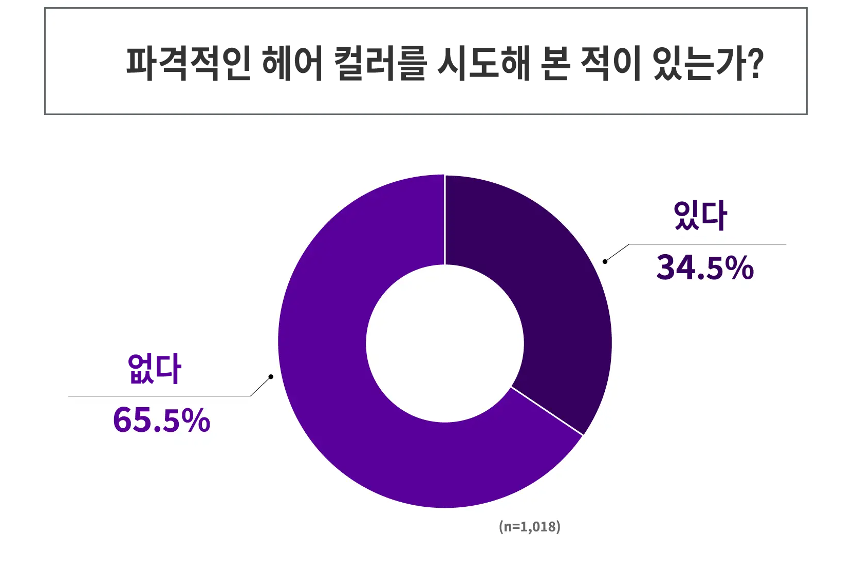 일본의 뷰티 브렌드 LiIBe가 2030 여성을 대상으로 최근 실시한 헤어컬러 관련 설문 결과에 따르면 응답자 1018명 중 34.5%가 ‘파격적인 헤어 컬러(선명하고 화려한 색상, 개성적인 색상 등)를 해본 경험이 있다'고 답했다. 파격적인 헤어컬러를 시도해 본 적이 있는 사람이 과반에는 미치지 못하지만, 일정 수준 이상으로는 형성돼 있다고 볼 수 있다.