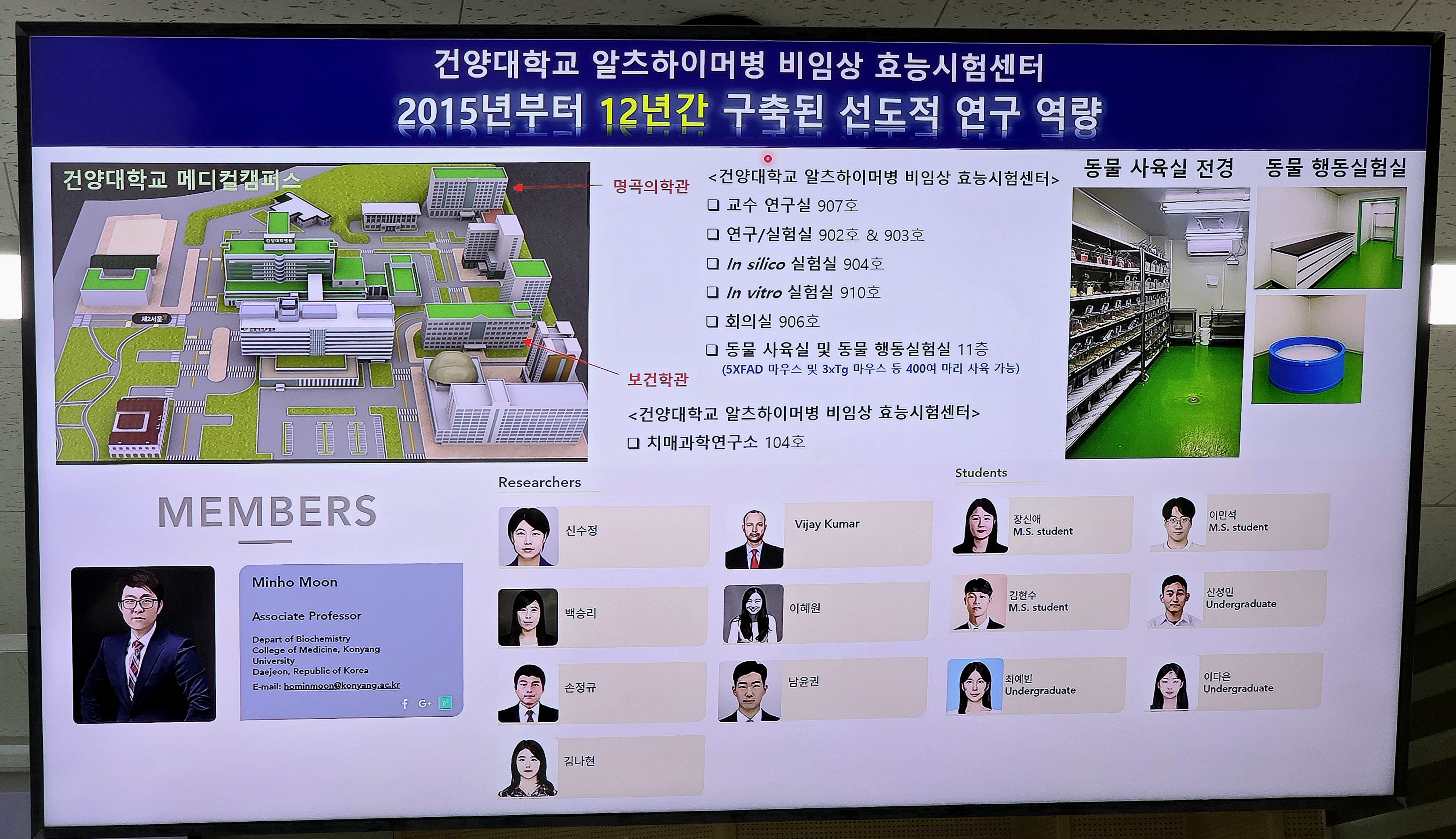 문민호 센터장은 알츠하이머병과 퇴행성 신경질환 분야에서 20년 이상 연구를 이어온 비임상 효능 평가 전문가다. 서울대학교 의과대학과 미국 하버드대 의과대학 맥클린 병원(McLean Hospital)에서 박사후 연구원으로 활동하며 신경퇴행성질환 비임상 연구 경험을 축적했다. 현재는 건양대학교 의과대학 생화학교실 부교수이자 알츠하이머병 비임상 효능시험센터장을 맡고 있다. 특히 알츠하이머병·퇴행성 신경질환 및 신경생물학 분야에서 총 120여편의 학술논문을 발표했으며, 이 가운데 80편 이상이 알츠하이머병 및 치매 동물모델을 활용한 연구로, 국내에선 손꼽히는 연구 성과로 평가받고 있다.