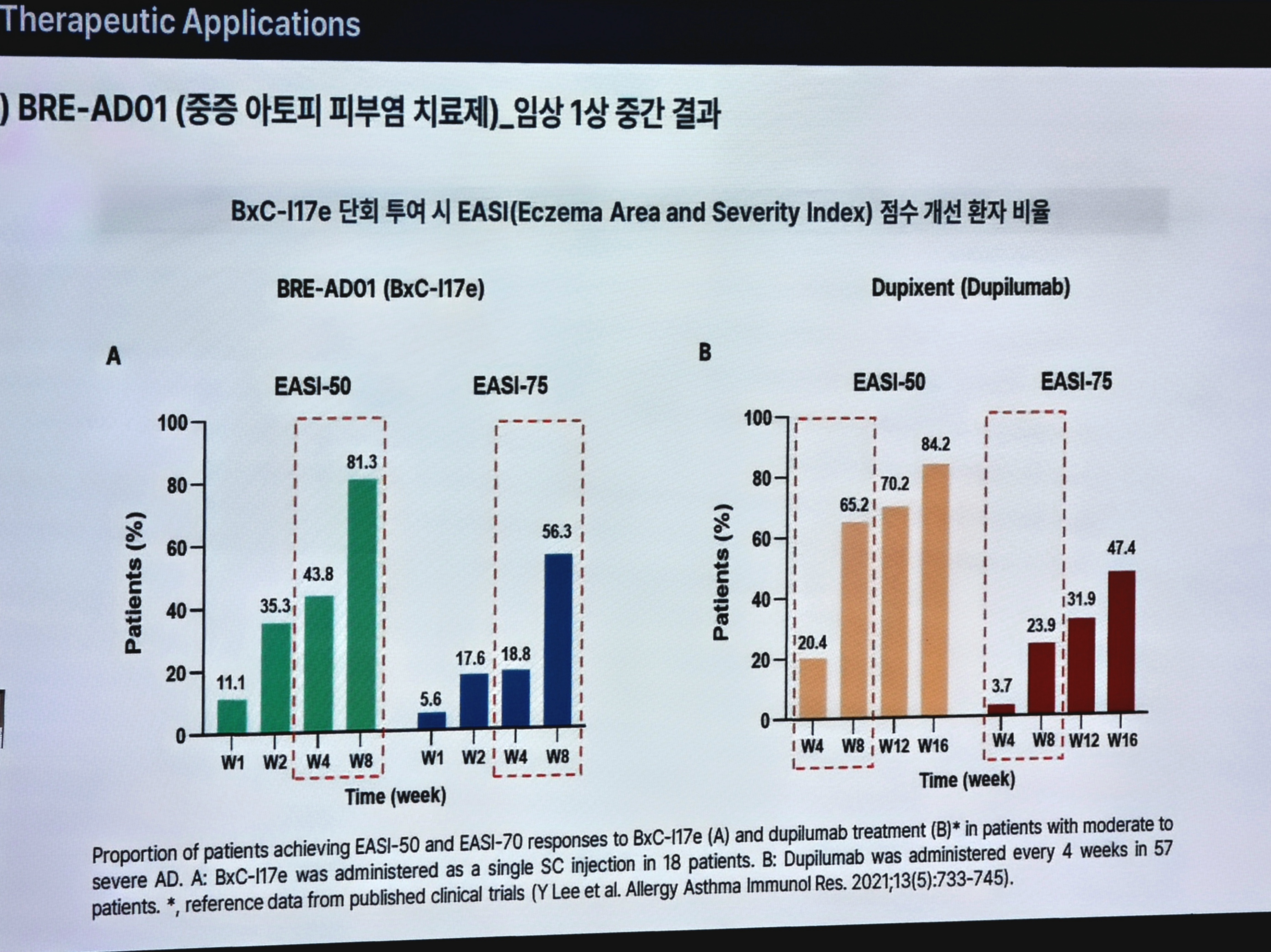 이번 중간 분석에서 BRE-AD01은 단회 투여 8주 시점 EASI-75 56.3%, EASI-50 81.3%를 기록했다. 1회 투여 후 8주까지 개선 효과가 유지된 점도 확인됐다.