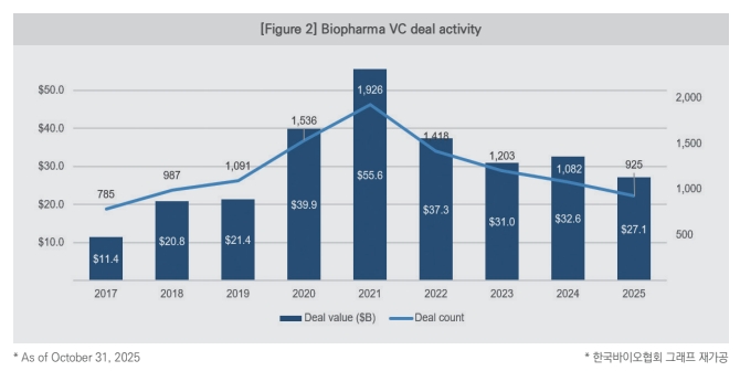 바이오제약(Biopharma) 부문=VC 투자금액은 2021년 556억 달러로 크게 확대되며 정점을 기록한 이후 감소세로 전환됐으며, 2024년 소폭 상승했으나 2025년 감소하며 271억 달러 수준으로 집계됐다. 거래 건수도 2021년 1,926건까지 증가했으나 이후 감소세로 전환되며 2025년 925건을 기록했다.
