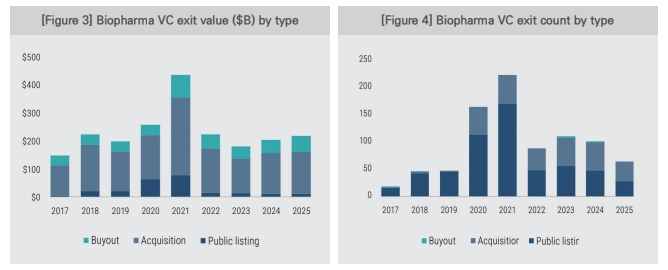 글로벌 바이오제약 VC 투자회수 금액은 2021년 약 4,500억 달러로 정점을 기록한 이후 감소세를 보이며 2025년 약 2,200억 달러 수준으로 축소됐으며, 투자회수 건수도 2021년 약 200건 이상으로 확대된 이후 감소 흐름이 이어져 2025년 약 60건 수준에 머문 것으로 나타났다.