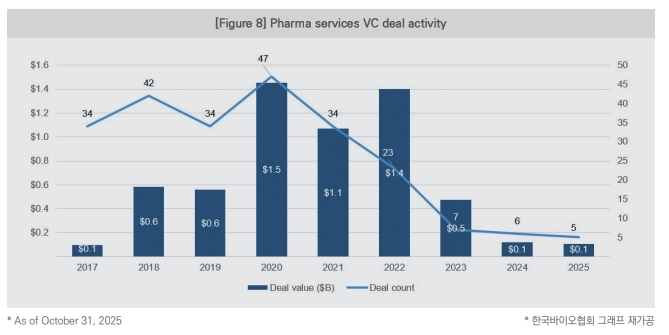 제약 서비스(Pharma services) 부문=VC 투자금액은 2020년 15억 달러까지 급증하며 2022년에도 높은 수준을 유지했으나 이후 빠르게 감소해 2025년 1억 달러 수준으로 축소됐다. 거래 건수는 2020년 47건을 정점으로 이후 급감하여 2025년 5건에 그쳤다.