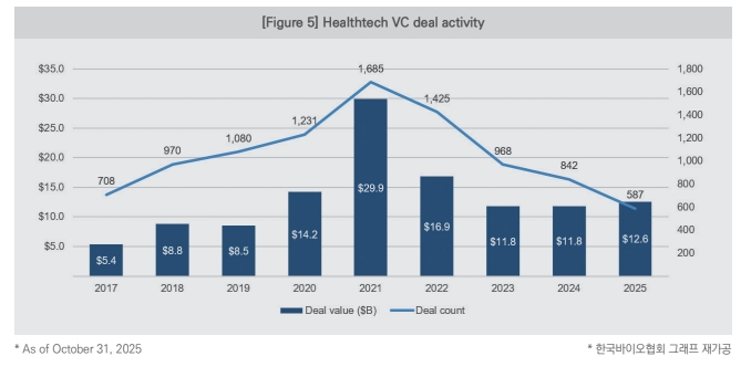 헬스케어 기술(Healthtech) 부문= VC 투자금액은 2021년 299억 달러로 최고치를 기록한 이후 감소세를 보이며 2023년 118억 달러 수준까지 축소됐으나, 2025년 126억 달러를 기록하며 소폭 상승했다. 거래 건수 역시 2021년 1,685건으로 정점을 기록한 이후 감소세로 전환돼 2025년 587건 수준으로 축소됐다.