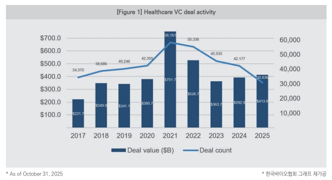 글로벌 헬스케어산업 VC 투자,2023년부터 회복...2025년 30836건 4138억불