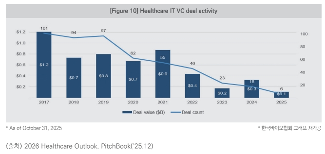 헬스케어 IT(Healthcare IT) 부문= VC 투자금액은 2017년 12억 달러에서 2021년 9억 달러 수준을 기록한 이후 감소세가 지속되며, 2025년 1억 달러 수준까지 축소됐다. 거래 건수도 2017년 101건에서 2025년 6건으로 급감하며 거래 활동이 크게 위축된 상황임을 나타났다.