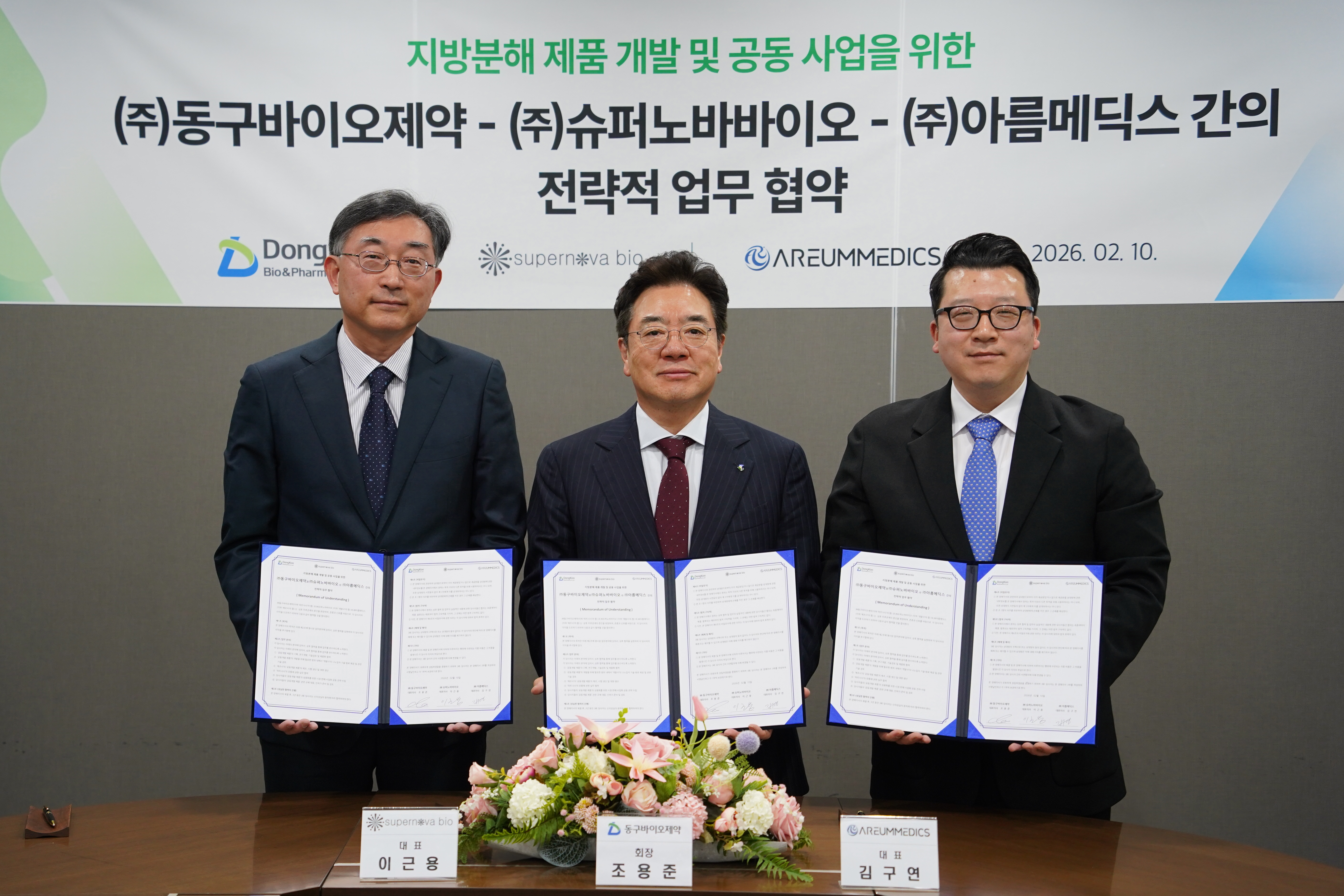 동구바이오제약, 의료용 나노 입자 전문기업 슈퍼노바바이오, 필러 플랫폼 기술을 보유하고 있는 아름메딕스가 지난 10일 ‘지방 분해-채움-재생’으로 이어지는 차세대 피부 미용 토탈 에스테틱 제품 개발 3자 간 업무협약(MOU)을 체결하고,기존 에스테틱 시장 패러다임을 전환하는 차세대 전략을 전개한다.