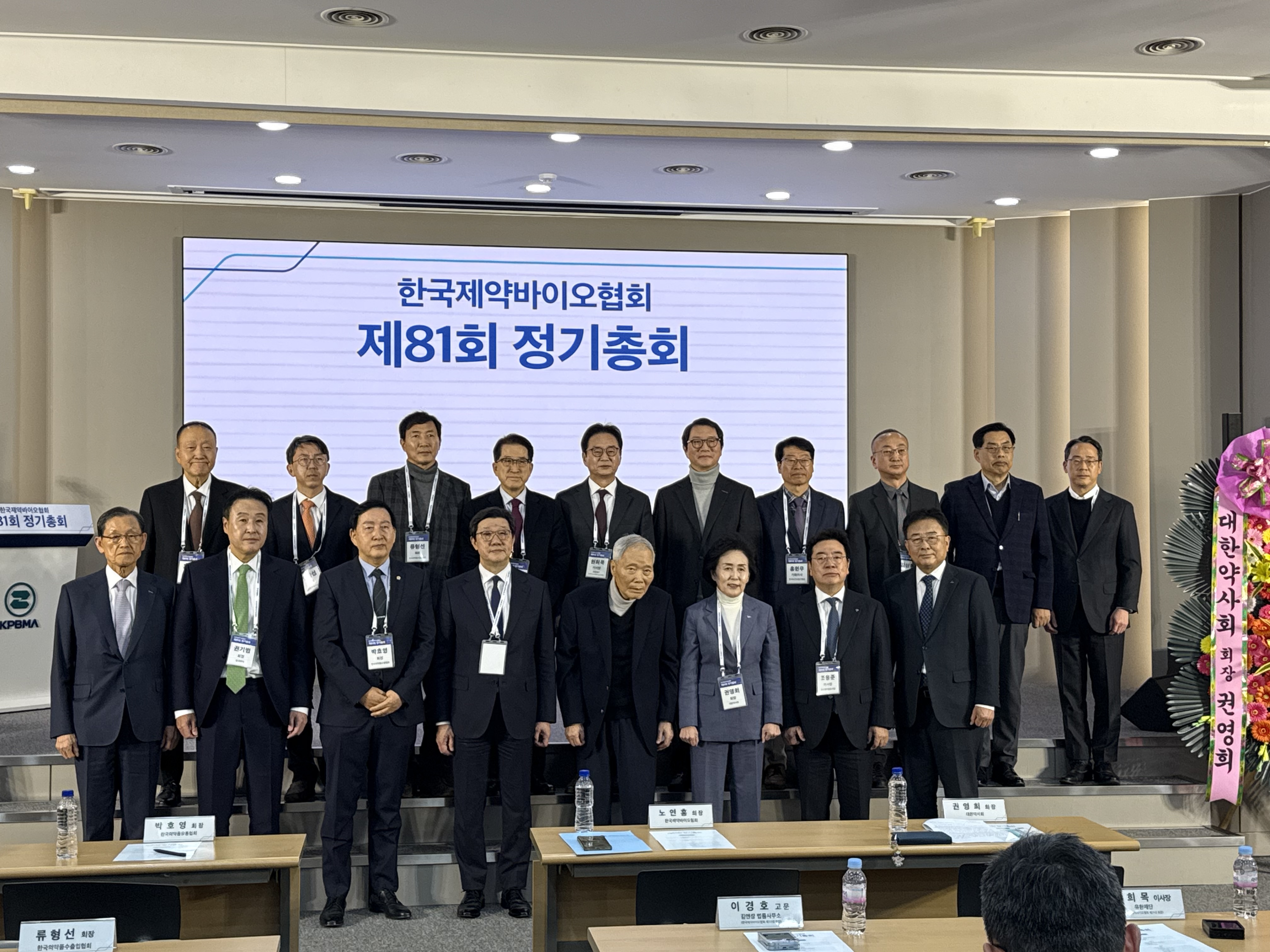 한국제약바이오협회는 24일 오후 서울 방배동 협회 회관 4층에서 제81회 정기총회를 개최했다. 이날 총회에는 노연홍 한국제약바이오협회 회장과 윤웅섭 이사장을 비롯해, 임강섭 보건복지부 제약바이오산업과장, 김상봉 식품의약품안전처 의약품안전국장, 권영희 대한약사회장, 박호영 한국의약품유통협회장 등 정부 및 약업계 주요 인사들이 대거 참석해 자리를 빛냈다.