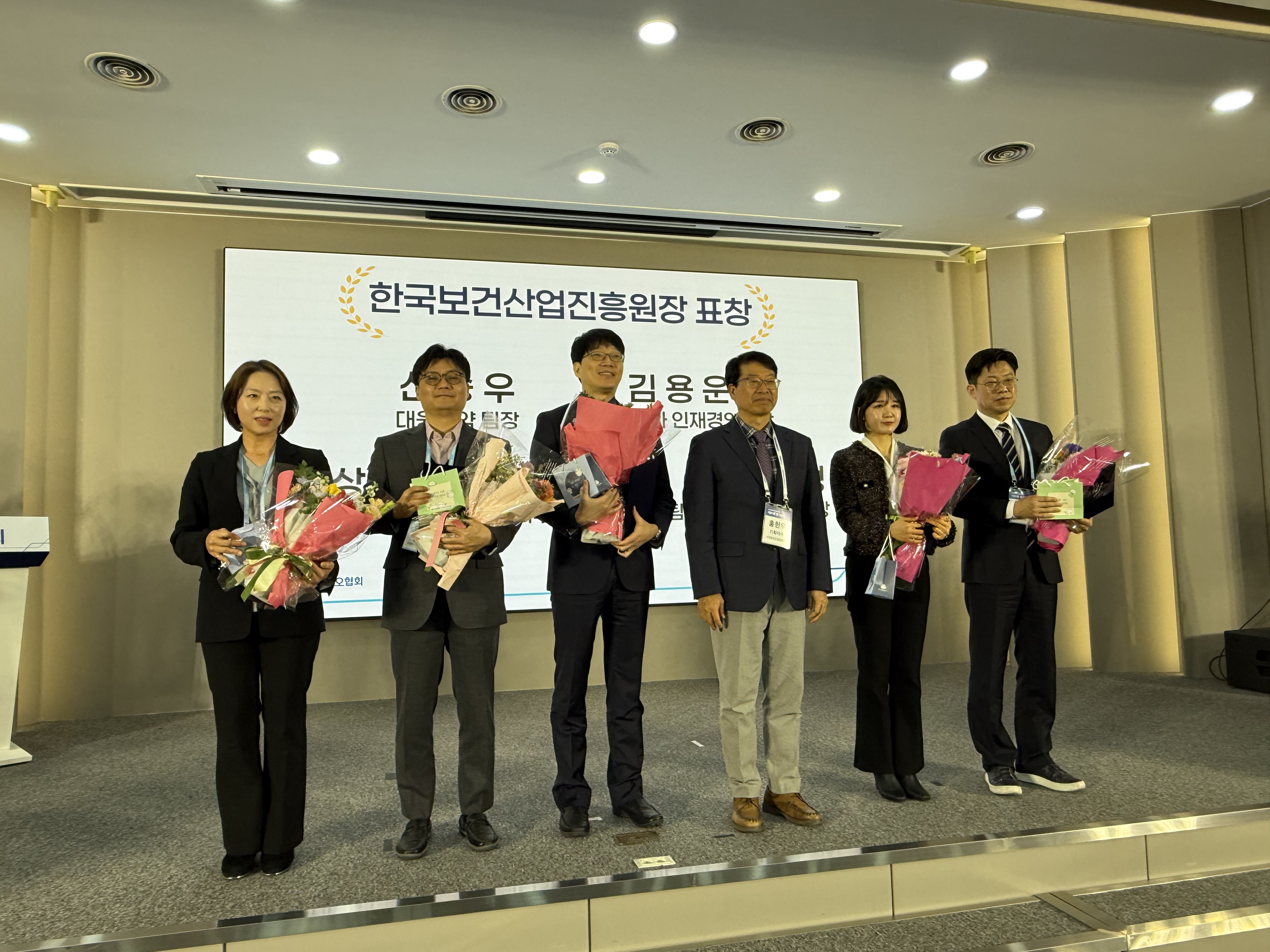 ▲ 한국보건산업진흥원장 표창 : 신승우 (대웅제약 팀장), 김용운 (GC녹십자 경영실장), 정상근 (충남대학교 교수), 임재성 (프레지니우스카비코리아 팀장), 이혜정 (건일제약 팀장)