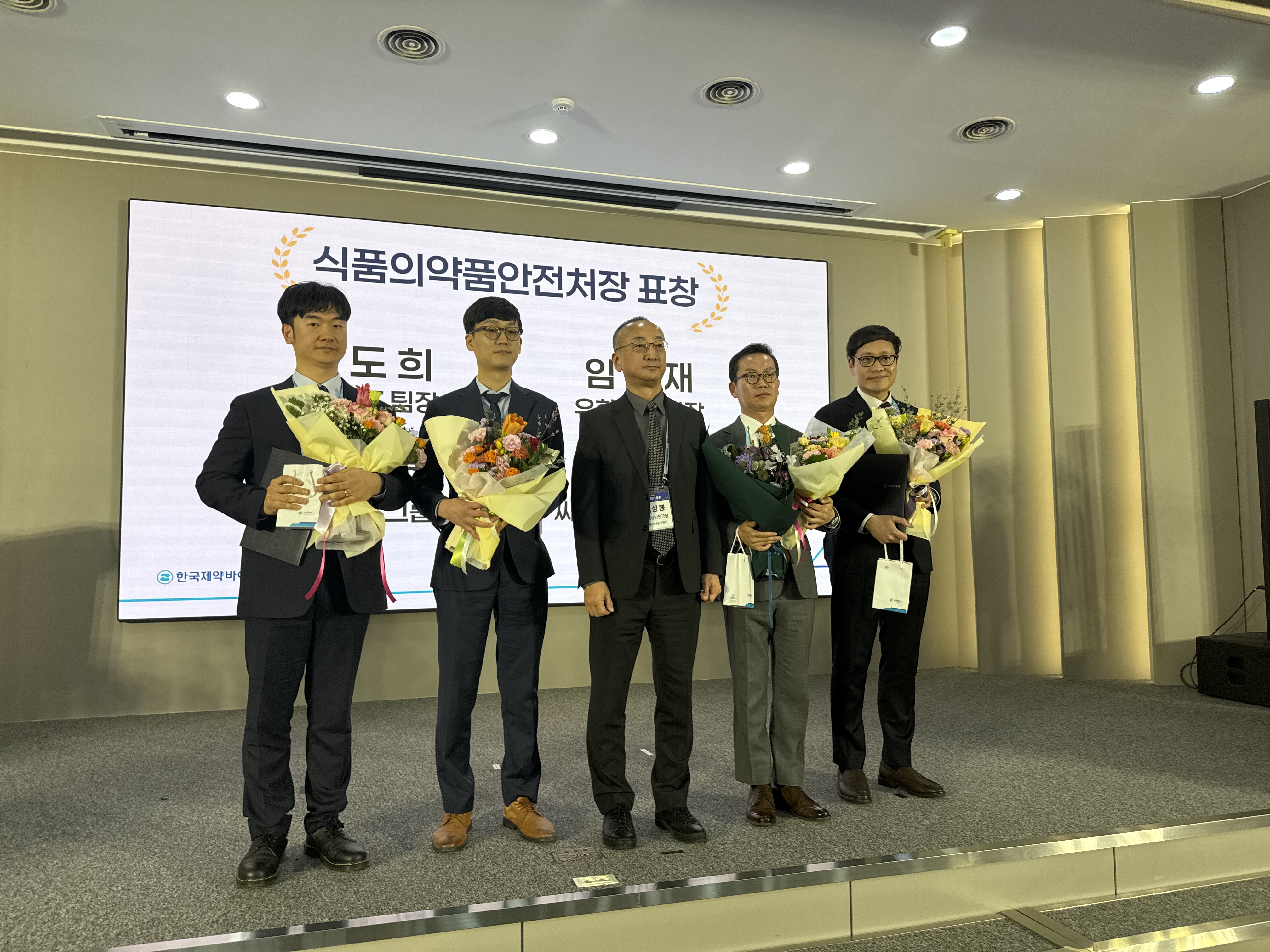 ▲ 식품의약품안전처장 표창 : 이도희 (동아ST 팀장), 임석재 (유한양행 부장), 윤철희 (한미약품 그룹장), 이명모 (씨지인바이츠 팀장)