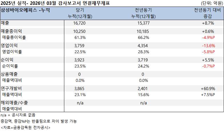 삼성바이오에피스가 2025년 매출은 증가했지만, 영업이익은 감소한 것으로 나타났다. 연구개발비가 크게 늘어나면서 수익성 지표는 전반적으로 하락했다.