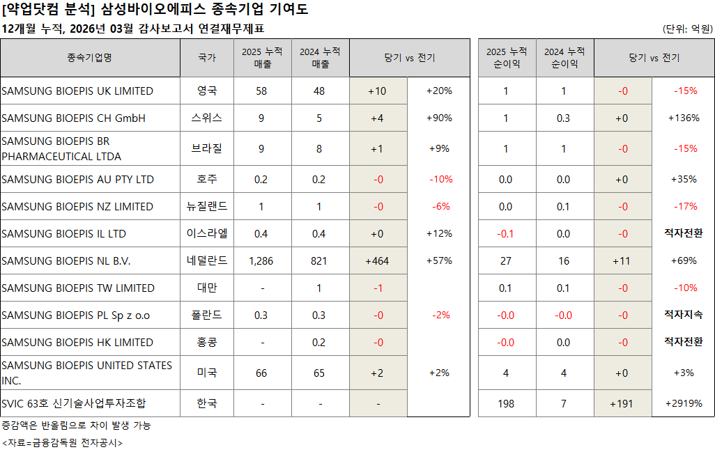 SAMSUNG BIOEPIS NL B.V.(네덜란드) 매출은 2025년 1286억원으로 전년 821억원 대비 464억원 증가했다. 증가율은 57%다. 순이익도 27억원으로 전년 16억원 대비 11억원 늘어 69% 증가했다.
