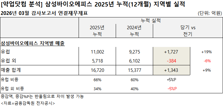 삼성바이오에피스 매출은 유럽 시장 중심으로 증가한 것으로 나타났다. 유럽 매출은 두 자릿수 성장세를 기록한 반면 유럽 외 지역 매출은 감소했다.