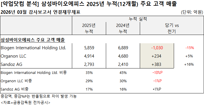 2026년 3월 공시된 삼성바이오에피스 감사보고서 연결재무제표에 따르면, 2025년 주요 고객 매출 가운데 Biogen International Holding Ltd. 매출은 5859억원으로 집계됐다.