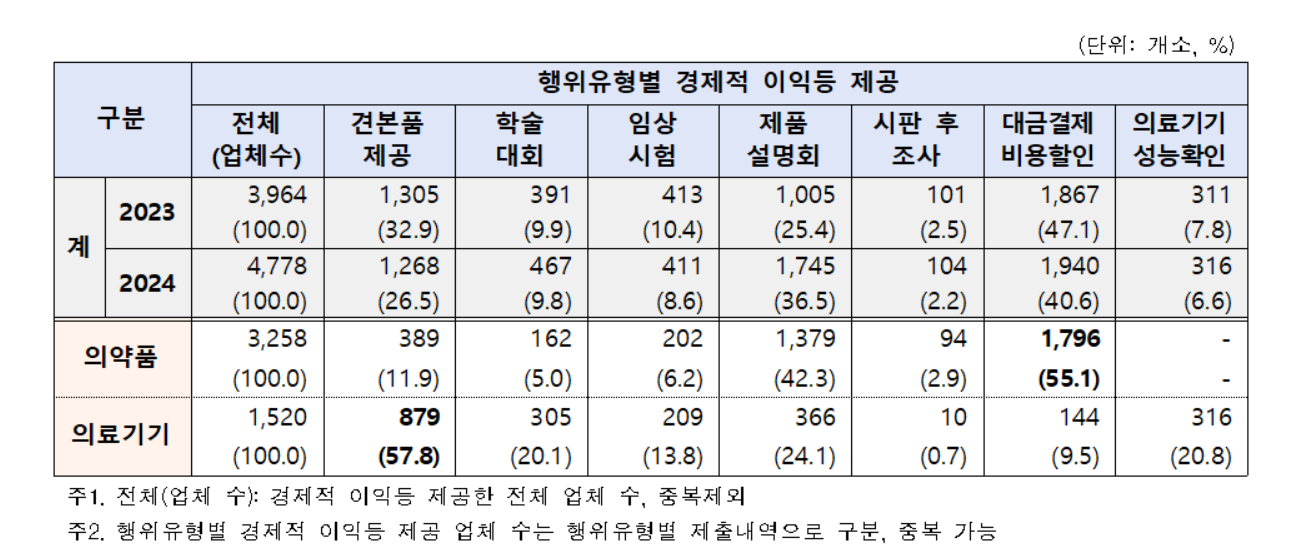 유형별로 보면 의약품 분야에서는 대금결제 조건에 따른 비용 할인(55.1%)이 가장 많았고, 의료기기 분야에서는 견본품 제공(57.8%)이 가장 높은 비중을 차지했다.