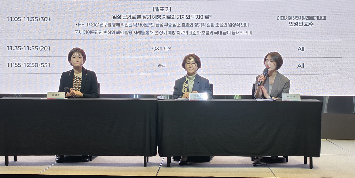 두 번째 발표를 맡은 이대서울병원 알레르기내과 안경민 교수는 ‘임상 근거로 본 장기 예방 치료의 가치와 탁자이로’를 주제로, 장기 예방요법의 임상적 효과와 실제 적용 가능성을 설명했다. 안 교수는 글로벌 3상 HELP 연구 결과를 근거로, 탁자이로 투여 시 급성 부종 발생 횟수가 최대 87% 감소하고, 장기 연장 연구에서도 평균 30개월 추적 기간 동안 대부분의 기간에서 발작이 발생하지 않는 상태가 유지됐다고 밝혔다.