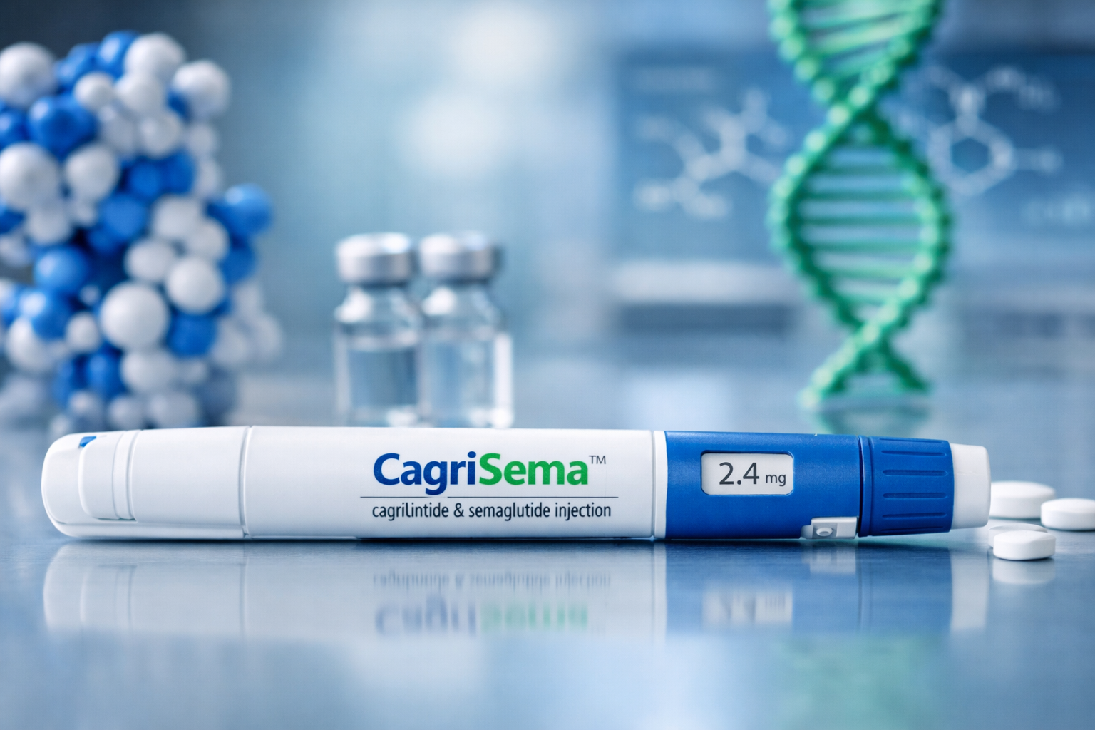 카그리세마는 GLP-1 수용체 작용제인 세마글루타이드와 아밀린 유사체 카그릴린타이드를 결합한 복합제다. GLP-1은 식욕 억제와 인슐린 분비 증가를 통해 혈당 조절과 체중 감소를 유도하고, 아밀린은 위 배출 지연과 포만감 유지에 관여한다. 두 기전은 서로 보완적으로 작용하며, 에너지 섭취 감소를 보다 지속적으로 유지하도록 설계됐다.