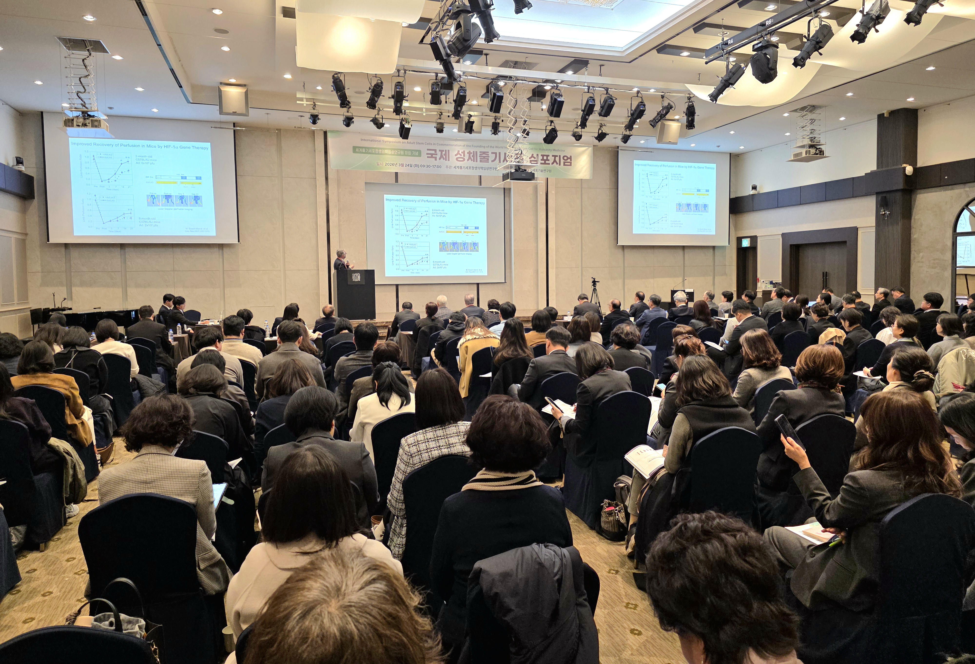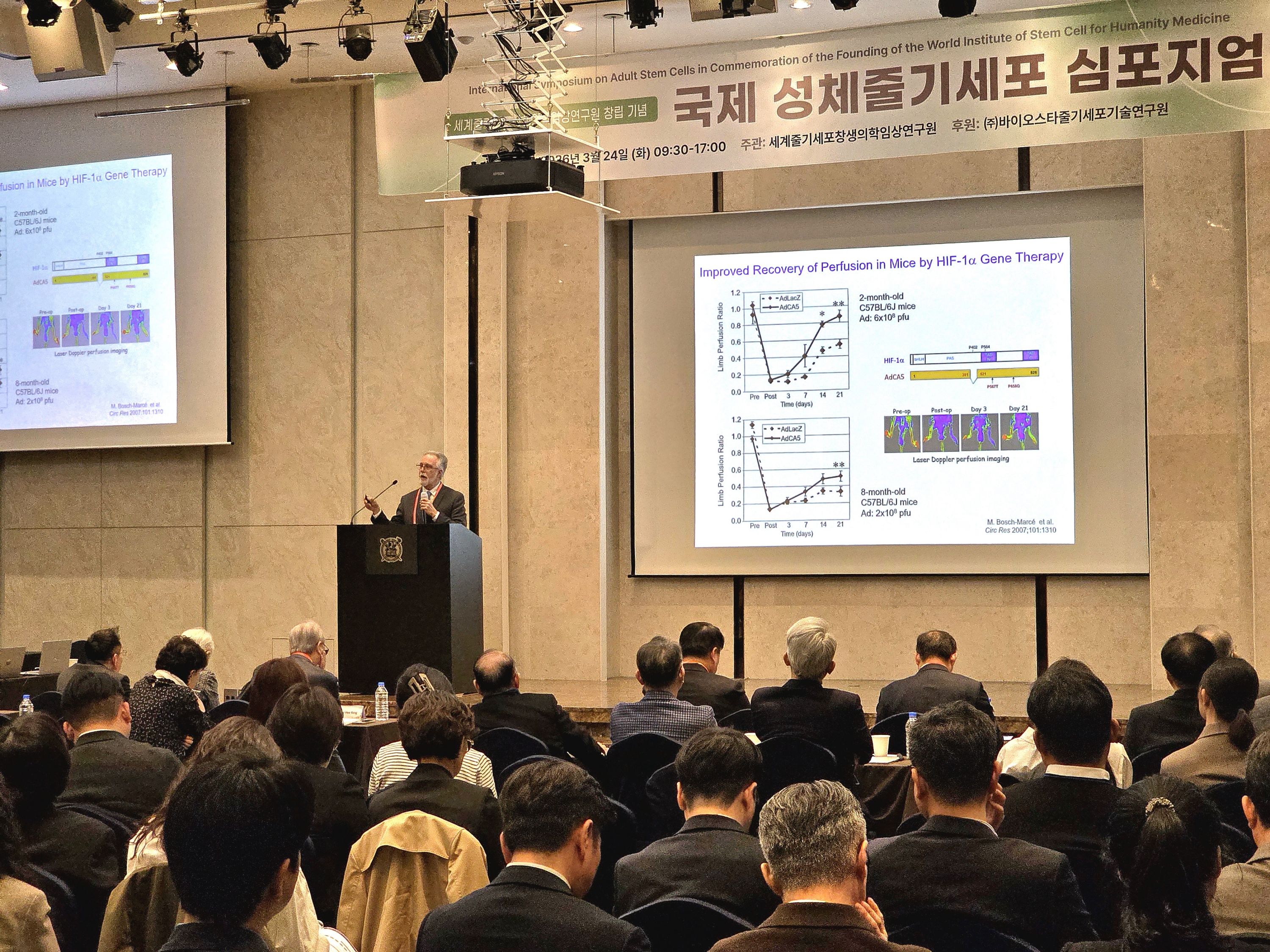 세멘자 교수는 치료 전략 핵심을 ‘환경 설계’로 설명했다. 그는 “허혈 조직에 단순히 세포를 주입하는 것은 효과적이지 않다”며 “먼저 혈관신생 신호를 만들어 세포가 스스로 찾아오도록 하고, 동시에 그 환경에서 생존할 수 있도록 준비시켜야 한다”고 강조했다.