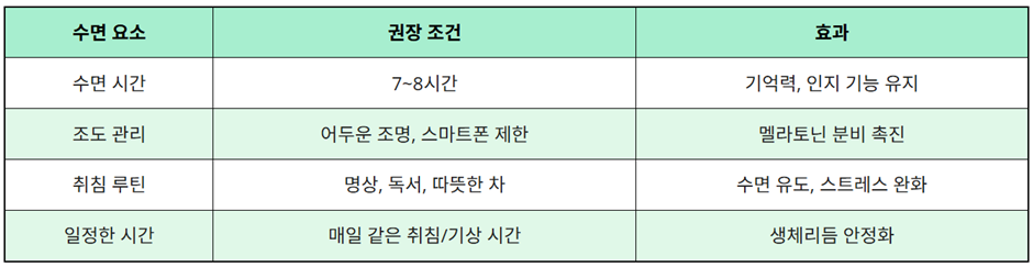 충분한 수면 하루 7~8시간의 충분한 수면은 뇌의 회복과 기억력 유지에 유익