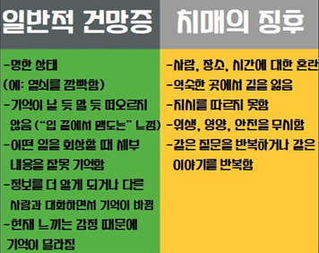 - 치매: 지속적이고 점진적인 기억력 저하, 힌트를 줘도 기억을 되살리지 못하고, 일상생활에 지장 초래