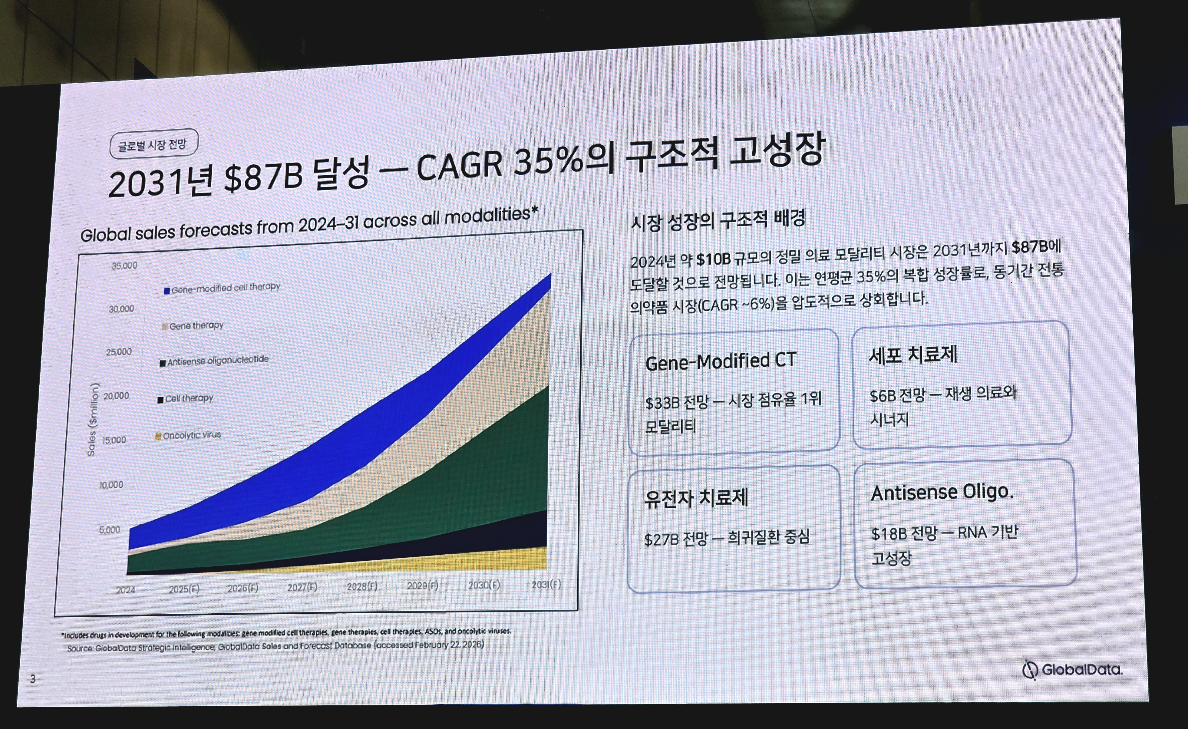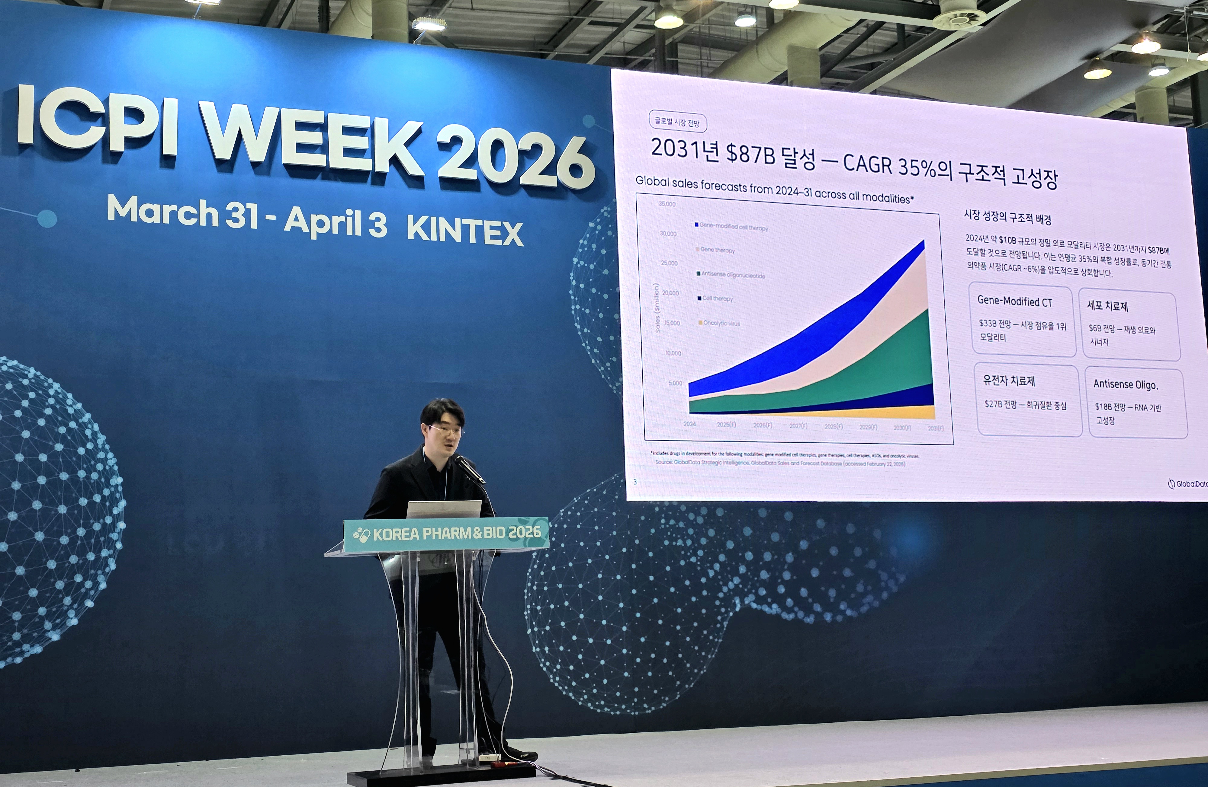그는 “정밀의료 시장은 연평균 약 35% 성장할 것으로 전망되며, 세포치료제, 유전자치료제, RNA 치료제 등 신규 모달리티가 성장을 주도하고 있다”고 분석했다. 이어 “정밀의료는 단일 기술이 아니라 다양한 플랫폼이 결합된 구조로, 결국 플랫폼을 얼마나 확보하느냐가 기업 경쟁력을 좌우한다”고 말했다.