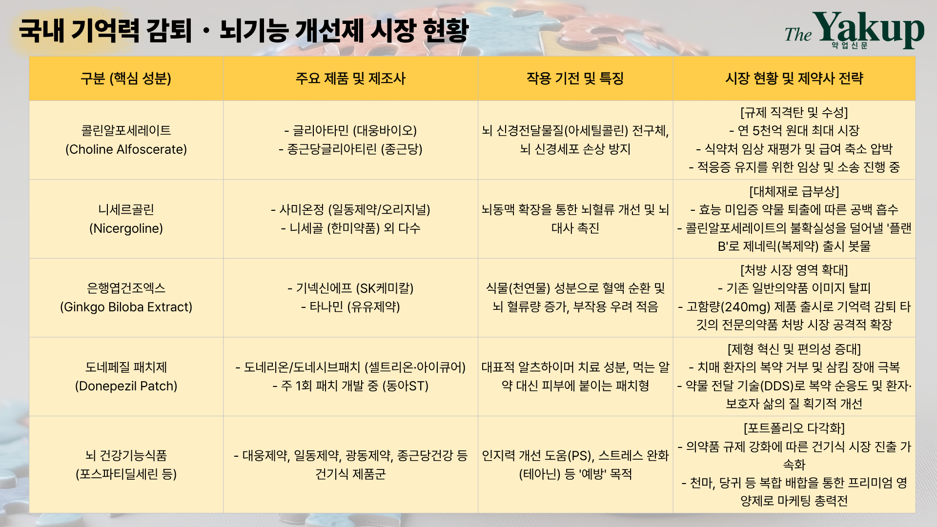 국내 기억력 감퇴 관련 제약 시장은 현재 옥석 가리기가 진행되는 중대한 변곡점에 서 있다. 뇌 영양제라는 막연한 기대감에 기대어 무분별하게 팽창했던 시장이 과학적 근거라는 엄중한 잣대 앞에 재편되고 있는 것이다.