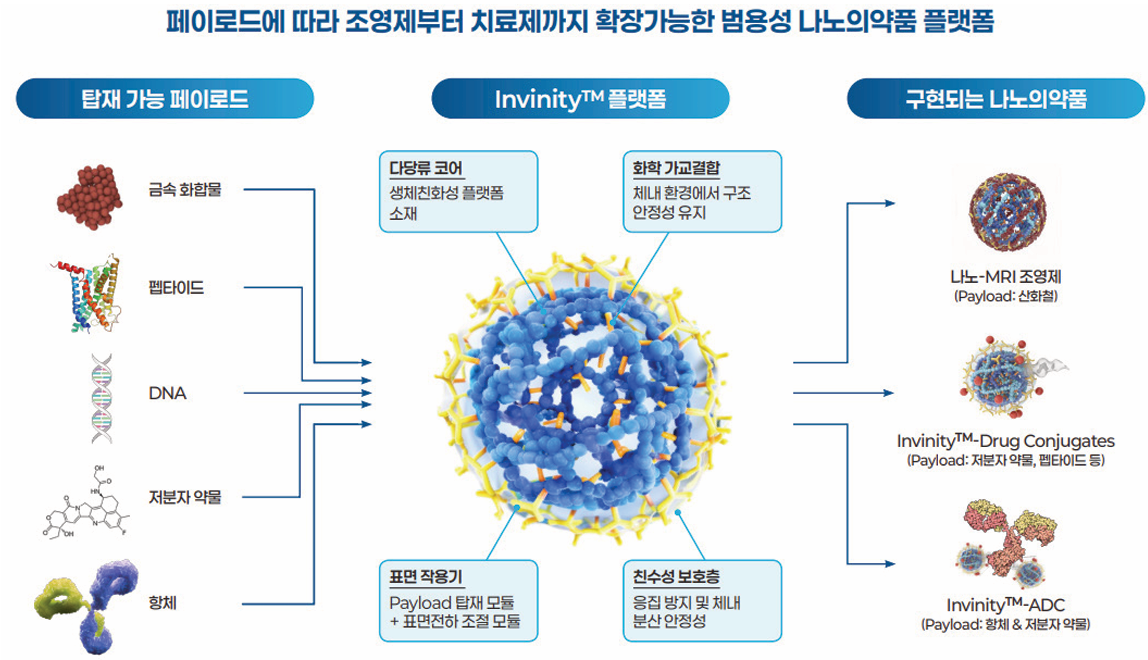 나아가 Invinity는 조영제에만 국한되지 않는다. 금속 화합물, 저분자 약물, 펩타이드, DNA, 항체 등 다양한 페이로드를 탑재할 수 있다. 나노-MRI 조영제는 물론 약물접합체와 항체-약물 접합체(ADC)까지 확장이 가능하다. 인벤테라는 이를 기반으로 조영제를 통해 플랫폼을 검증한 뒤, 치료제 영역으로 확장하는 단계적 전략을 추진하고 있다.