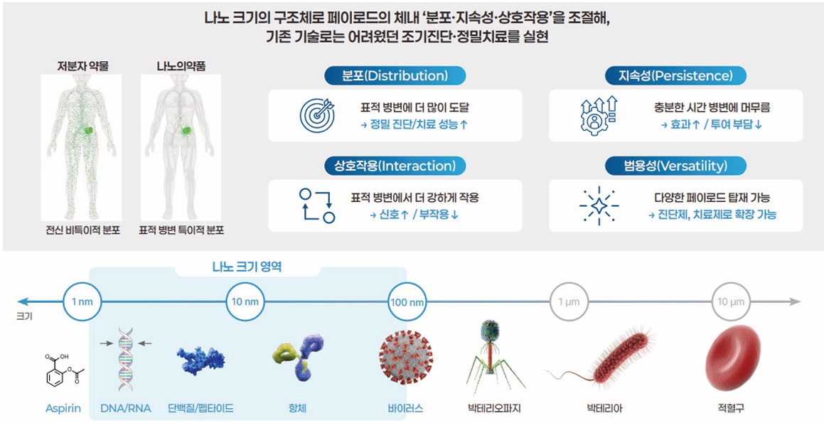 나노의약품은 약물의 크기를 줄이는 개념이 아니라, 체내에서의 거동 자체를 설계하는 기술이다. 나노미터 단위 구조체를 활용해 약물의 분포, 지속성, 상호작용을 정밀하게 제어함으로써 기존 의약품으로는 구현하기 어려웠던 정밀 진단과 표적 치료를 가능하게 한다. 특히 표적 병변에 더 많이 도달하고, 더 오래 머물며, 더 강하게 작용하도록 설계할 수 있다는 점에서 기존 저분자 약물과 근본적으로 다른 접근이다.