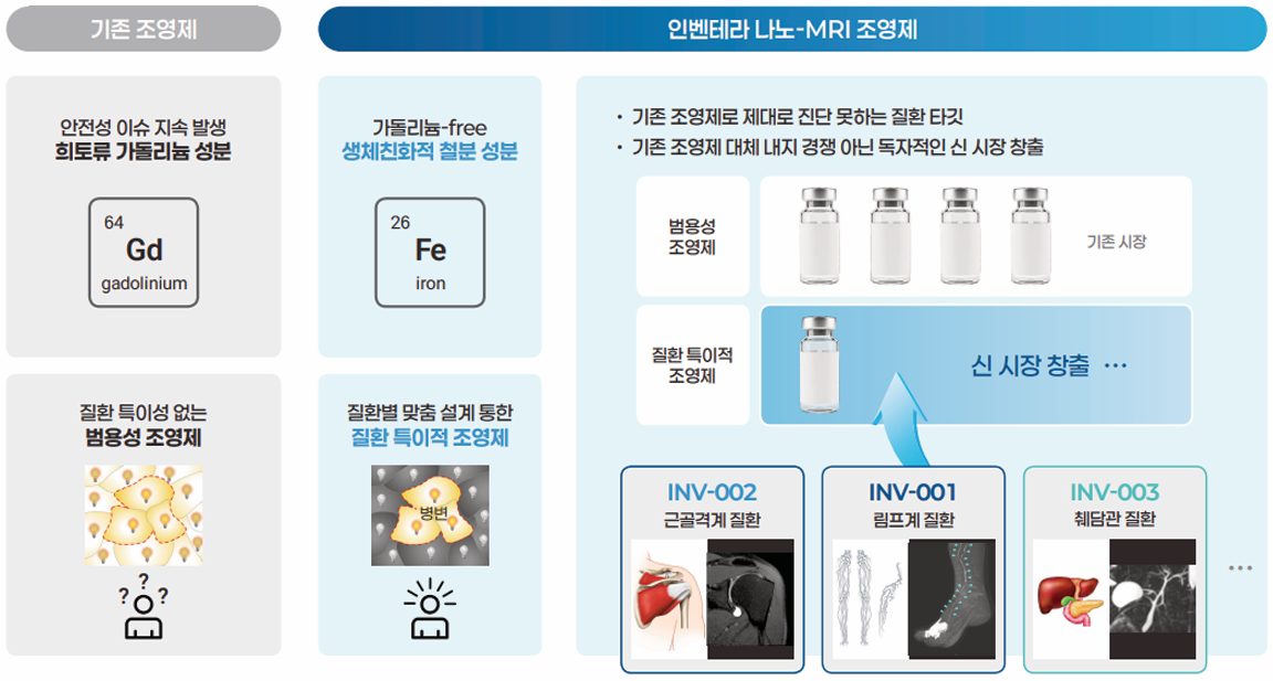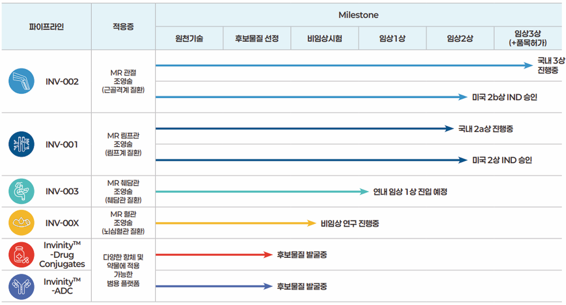 가장 상업화에 근접한 파이프라인은 근골격계 질환 특화 나노-MRI 조영제 ‘INV-002’다. 근골격계 질환은 전 세계 환자 수가 약 17억명에 달하는 대규모 시장임에도 불구하고, 자기공명관절조영술(MRA)에 사용할 수 있는 허가된 전용 조영제가 없는 상태다.
