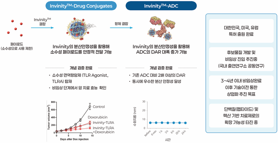 동시에 Invinity-ADC(항체약물접합체) 개발도 병행하고 있다. 기존 ADC는 약물-항체 결합 비율(DAR)이 높아질수록 입자 응집과 독성 문제가 발생하는 구조적 한계를 지니고 있었다. Invinity 플랫폼은 높은 분산 안정성을 기반으로 DAR을 기존 대비 2배 이상 끌어올리면서도 안정성을 유지할 수 있는 설계를 구현했다. 동일 항체에 더 많은 약물을 탑재하면서도 안전성을 확보할 수 있다는 점에서, ADC의 치료 효능을 한 단계 끌어올릴 수 있는 기술적 기반으로 평가된다.