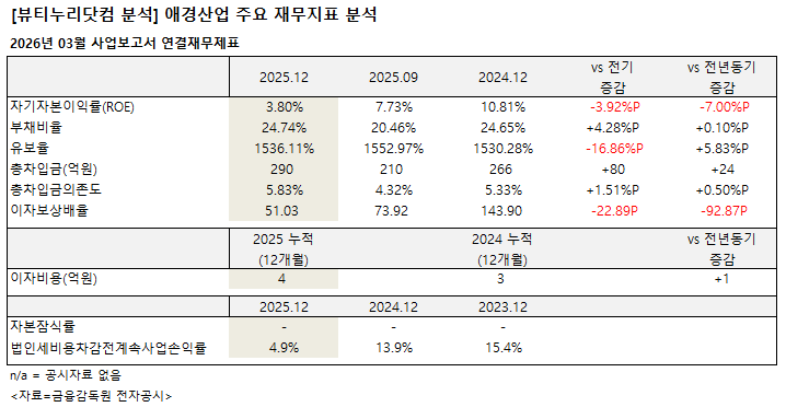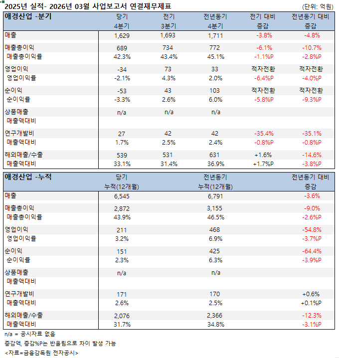 34억원의 영업손실을 기록, 영업이익을 올렸던 전기(73억원) 및 전년동기 (33억원) 대비 적자전환됐다. 영업손실률은 2.1%. 53억원의 순손실이 발생, 순이익을 기록했던 전기(43억원) 및 전년동기(103억원) 대비 적자전환됐다. 순손실률은 3.3%.