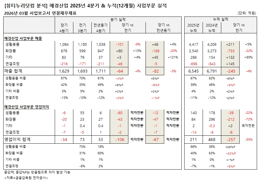 4분기의 경우 화장품과 생활용품 모두 영업손실과 순손실이 발생하면서 적자전환됐다.