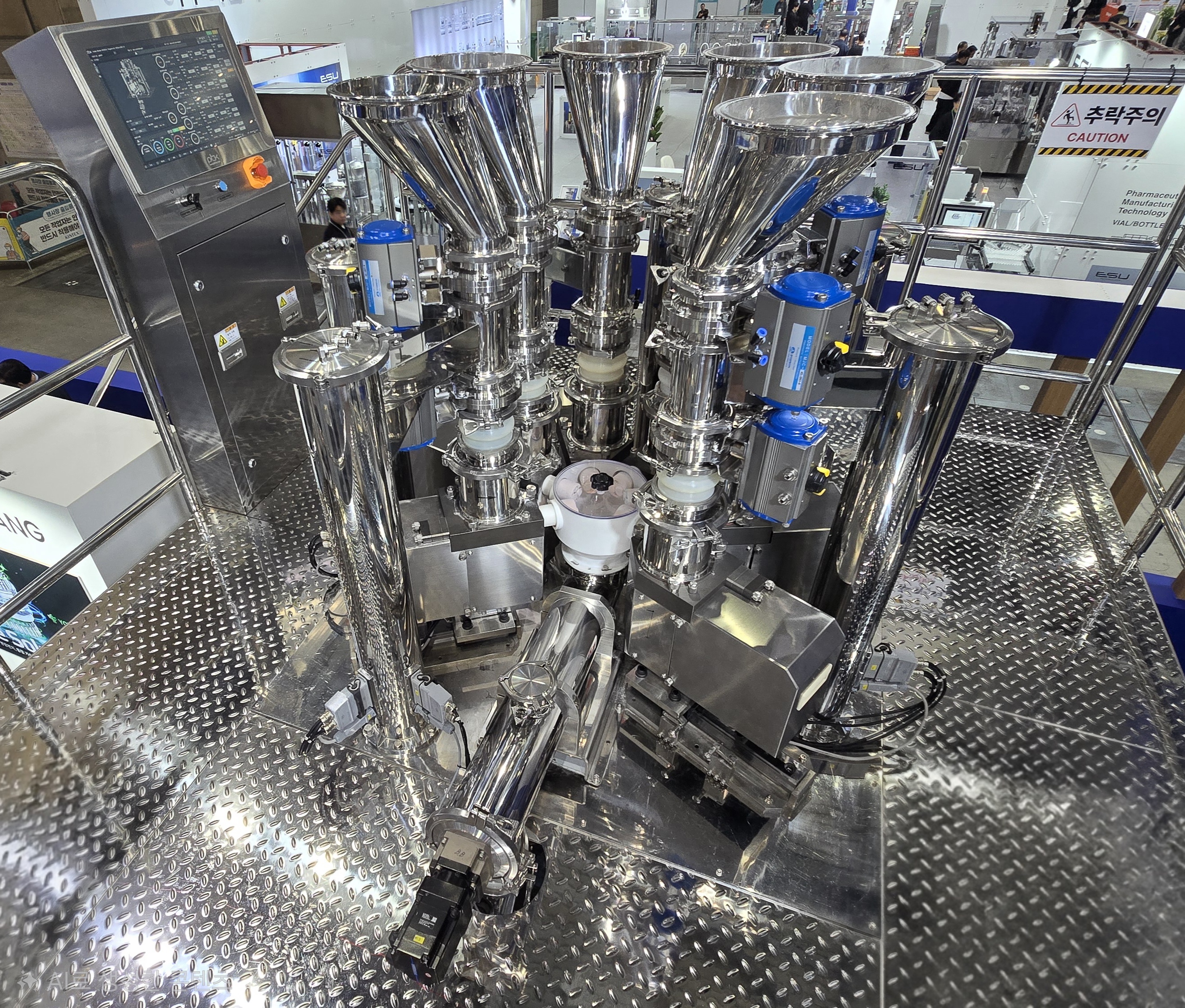 이번 전시에서는 단일 장비를 넘어 혼합·측정·타정 공정을 하나의 흐름으로 연결한 연속공정 기반 생산 시스템도 함께 소개됐다. 원료를 투입하면 혼합 단계에서부터 근적외선분광법(NIR)을 통해 함량을 실시간 분석하고, 기준에 맞는 혼합물만 다음 공정으로 전달되는 구조다.