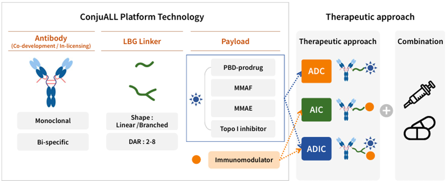 리가켐은 강력한 ConjuALL 플랫폼을 다양한 방법으로 응용하고 있다. 전통적인 단클론항체에서 이중항체(Bispecific ADC)로 확장하거나 독성페이로드 대신 면역세포를 활성화하는 면역조절제(Antibody Immunomodulator Conjugates, AIC) 혹은 페이로드와 면역조절제를 동시에 연결하는 방식(Antibody Drug&Immunomodulator Conjugates, ADIC)도 연구하고 있다. 다른 치료제들과 병용투여할 수도 있다.