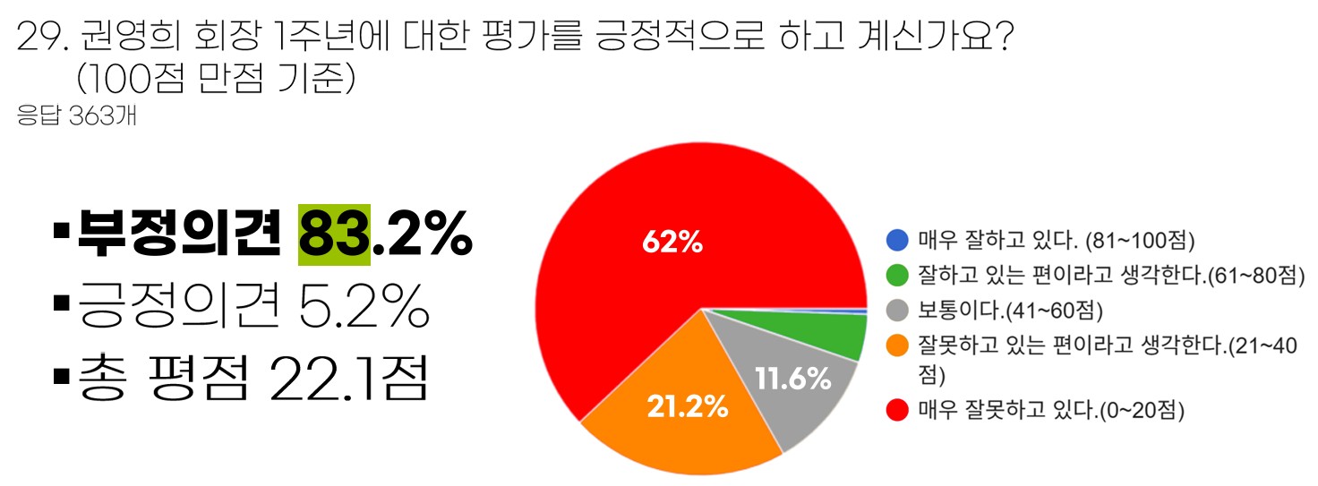 권영희 집행부 출범 1년을 맞아 실시된 약사 대상 설문에서 정책 전반에 대한 부정적 평가가 압도적으로 나타났다.