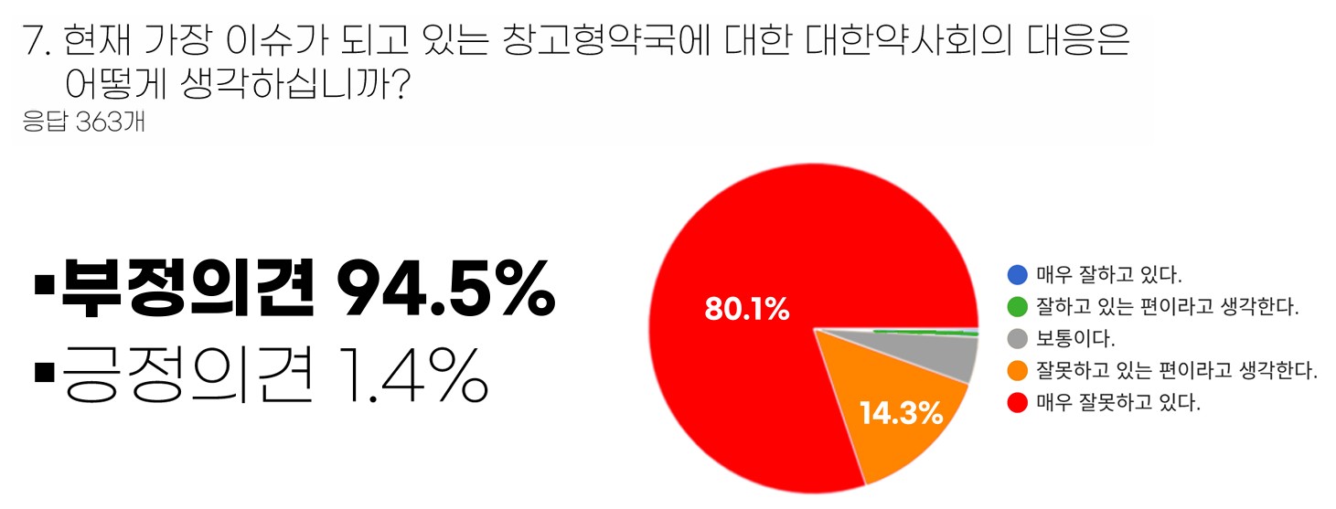 특히 주요 현안 대응에 대한 불만이 집중됐다. 창고형 약국 대응에 대해서는 부정 평가가 94.5%에 달해 사실상 대부분의 응답자가 부정적으로 인식하고 있는 것으로 확인됐다. 이는 이번 조사에서 가장 높은 부정 응답 비율로, 집행부의 핵심 현안 대응력에 대한 회원들의 실망이 극명하게 드러난 대목이다.