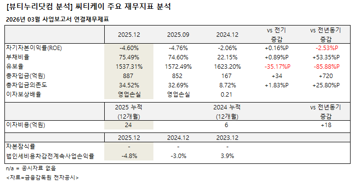 약업신문 자매지 화장품신문이 금융감독원 공시 2026년 3월 사업보고서(연결기준) 분석 결과 씨티케이는 지난해 자기자본이익률(ROE)은 -4.60%로 집계됐다. 전기(이하 1~9월) -4.76% 대비 0.16%p 상승했으나, 전년 -2.06%보다는 2.53%p 하락했다.