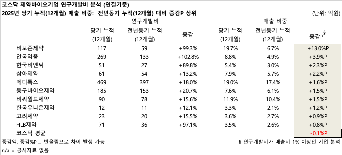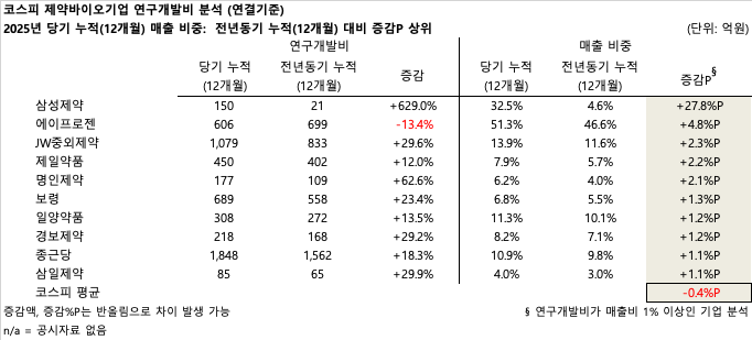 전년동기 대비 매출 비중 증감폭(%p)은 삼성제약이 27.8%p 수직 상승하며 연간 강한 연구 역량 강화를 견인한 것으로 분석된다. 아울러 에이프로젠, JW중외제약, 제일약품 등 매출 대비 연구개발 지출 비율을 높인 기업들이 상위권에 대거 포진하며 기술집약적 기업으로의 체질 개선이 꾸준히 이어지고 있음을 증명했다. 주요 상승 기업들의 순위와 증감%p를 살펴보면 1위 삼성제약(+27.8%p), 2위 에이프로젠(+4.8%p), 3위 JW중외제약(+2.3%p), 4위 제일약품(+2.2%p), 5위 명인제약(+2.1%p), 6위 보령(+1.3%p), 7위 일양약품(+1.2%p), 8위 경보제약(+1.2%p), 9위 종근당(+1.1%p), 10위 삼일제약(+1.1%p) 순으로 나타났다.