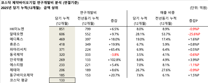 누적 연구개발비 규모는 HK이노엔이 851억원을 기록하며 코스닥 R&D 호실적을 강하게 견인한 것으로 분석된다. 아울러 알테오젠, 메디톡스, 휴온스 등 신약 파이프라인 및 에스테틱 기술 리딩 기업들이 상위권에 대거 포진하며 확실한 캐시카우를 앞세운 산업 확장이 꾸준히 이어지고 있음을 증명했다. 주요 상위 기업들의 순위와 규모를 살펴보면 1위 HK이노엔(851억원), 2위 알테오젠(606억원), 3위 메디톡스(469억원), 4위 휴온스(418억원), 5위 파마리서치(371억원), 6위 동국제약(320억원), 7위 안국약품(269억원), 8위 에스티팜(233억원), 9위 제테마(206억원), 10위 동구바이오제약(185억원) 순으로 나타났다.